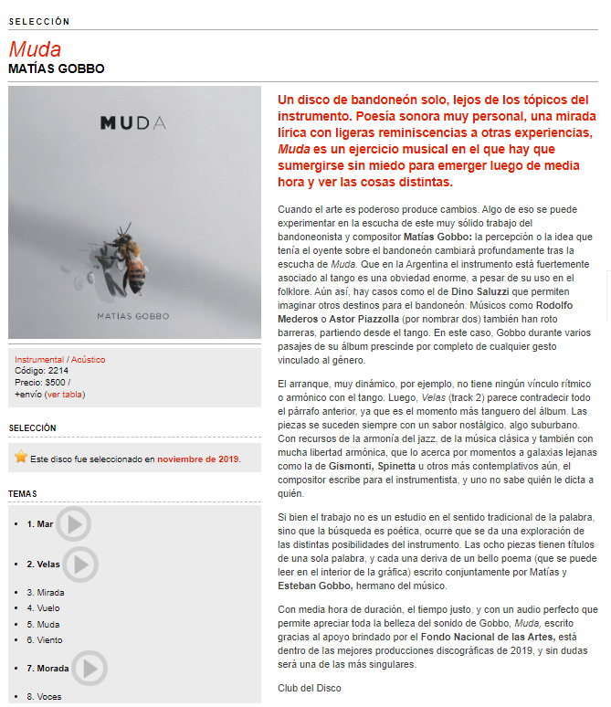 «Un disco de bandoneón solo, lejos de los tópicos del instrumento. Poesía sonora muy personal, una mirada lírica con ligeras reminiscencias a otras experiencias, MUDA es un ejercicio musical en el que hay que sumergirse sin miedo para emerger luego de media hora y ver las cosas distintas». Club del Disco
